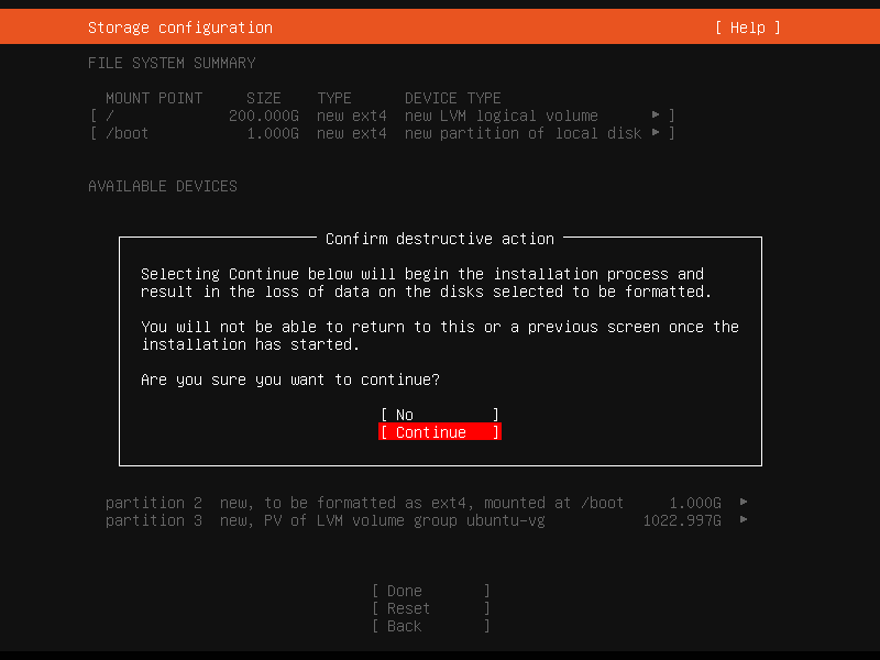 다음 설정은 해당 디스크에 대한 파일 시스템 설정으로 여기서 Ubuntu-vg은 500GB로 잡아 주었습니다. (Ubuntu-vg은 Volume Group 으로 일종의 서버의 용량 정도로 생각 하시면 됩니다. 깊게 설명하면 복잡해서 나중에 따로 설명 하겠습니다.)